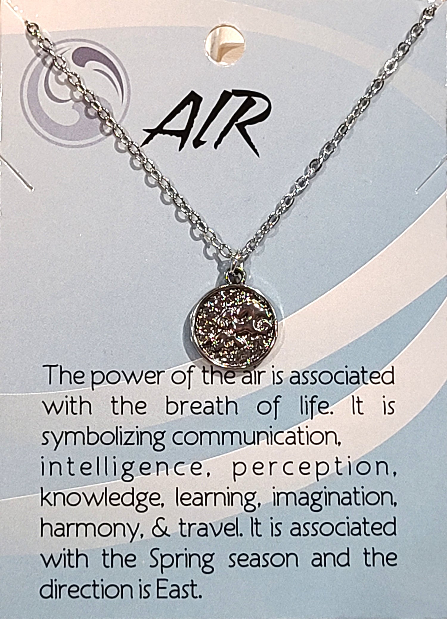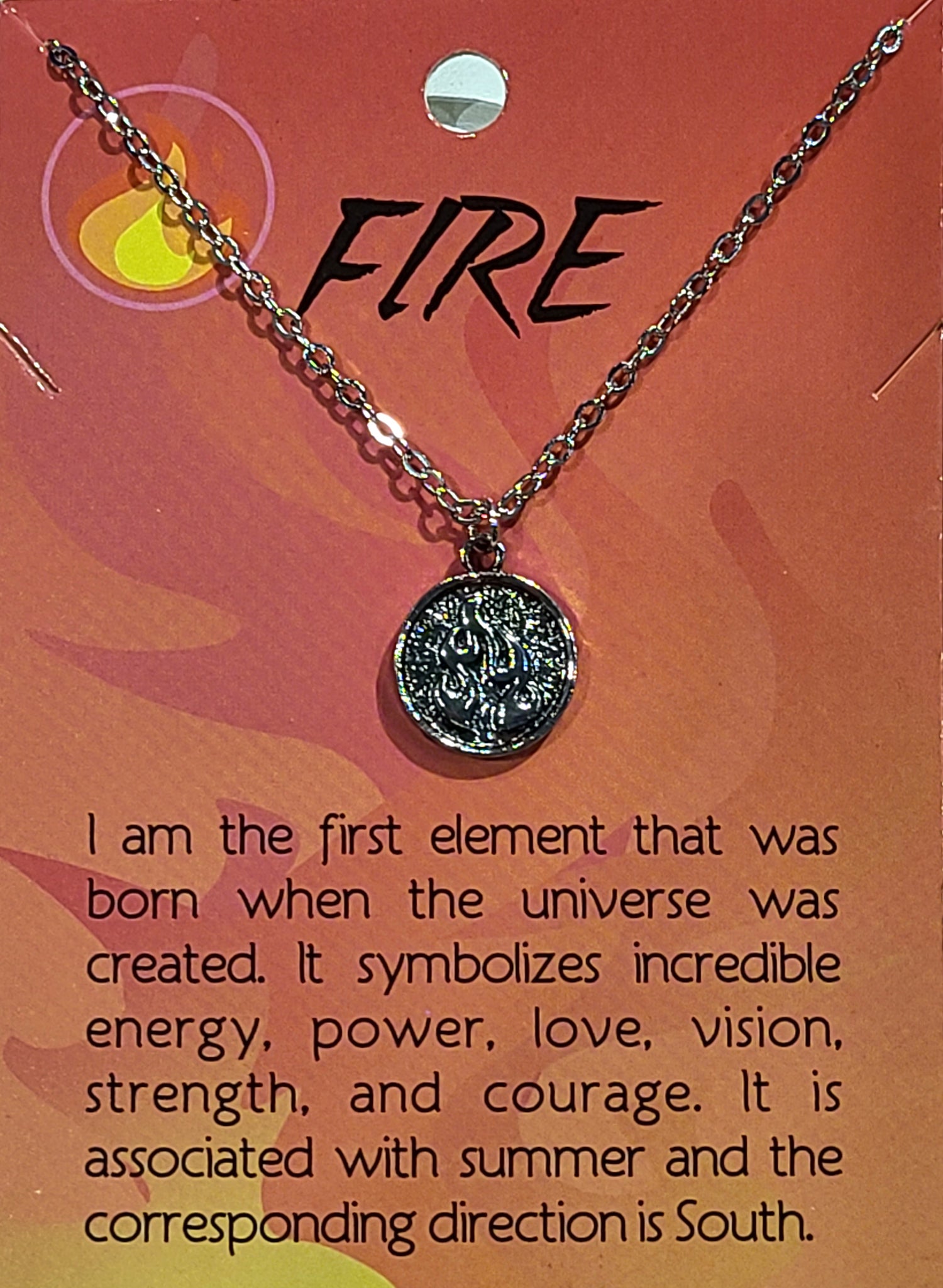 Choose from the four elements of Earth, Water, Air or Fire. The pendant is about 1/2 an inch in diameter on a silvertone 18" chain with a 2" extension.