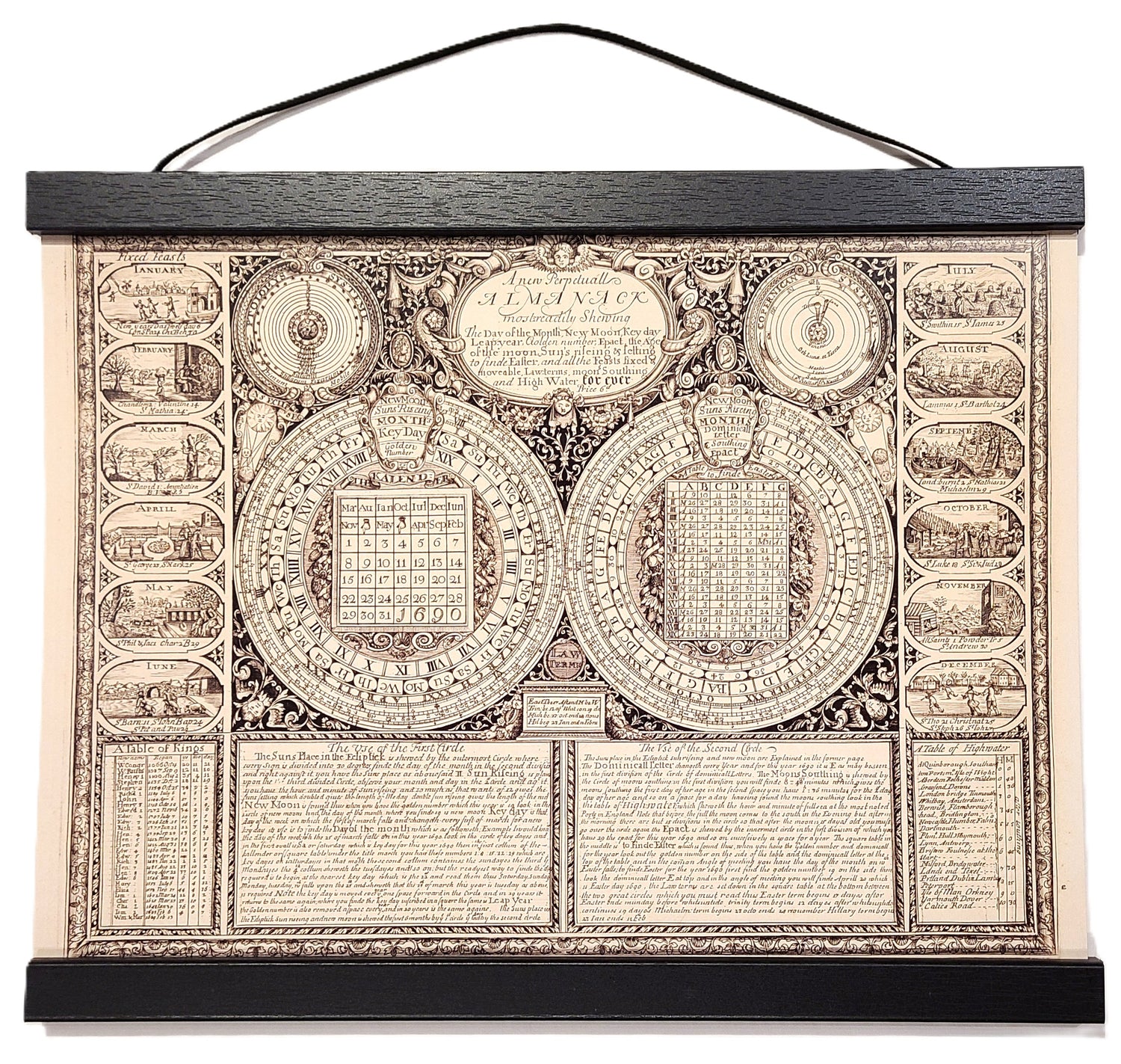 This perpetual almanac is attributed to an engraving by Simon Gridelin II, A new Perpetuall ALMANACK, 1690. The frame is comprised of magnetic slats that hold the coated poster and rigid backing securely in place. Dimensions are 12 7/8" x 16 5/8".