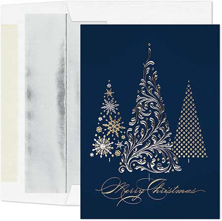 Metallic Treeline Christmas Greeting Card Set. 15 identical greeting cards with 15 silver foil lined envelopes. Inside reads "Wishing you the most joyous holiday season and happiness in the new year" in blue ink. Each card measures 5 5/8" x 7 7/8".